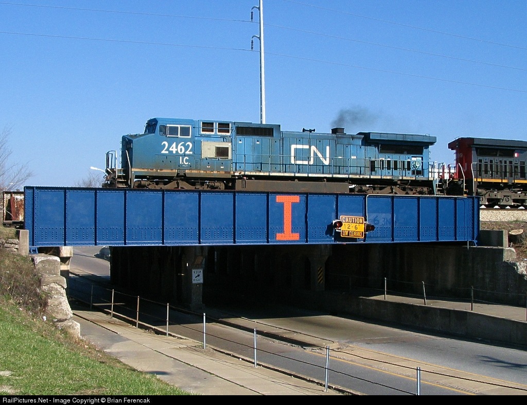 | The blue bridge is an out of service railroad bridge, but it is appropriately lettered for the hometown Fighting Illini. A semi-rare IC (CN) unit chugs across the adjacent bridge the day before the Illini battle for the NCAA title in St Louis. |