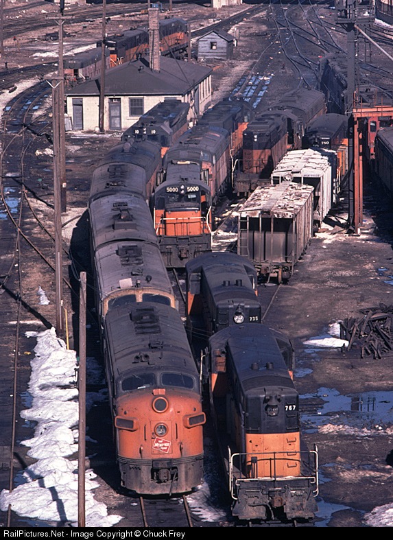 | An incredible variety of Milwaukee Road power is lined up outside the shops, including F-units, several FM switchers, a GE and even a rare SD45 |