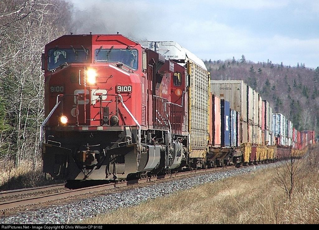 CP SD9043AC 9100 leads hotshot CP #107-CP 9100, 9750, 1 h/e autorack, intermodal-380 axles @ 16:22 up the grade on the approach to Marathon. note: it looks like the bulb blew up