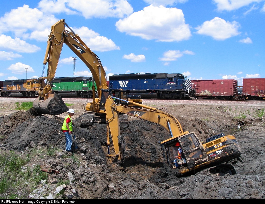 Work on the Lincoln Yard Expansion pauses as a track hoe is worked loose from a sinkhole. Meanwhile, a trio of EMDs slowly eases through the yard with the engineer glancing over at the mess.