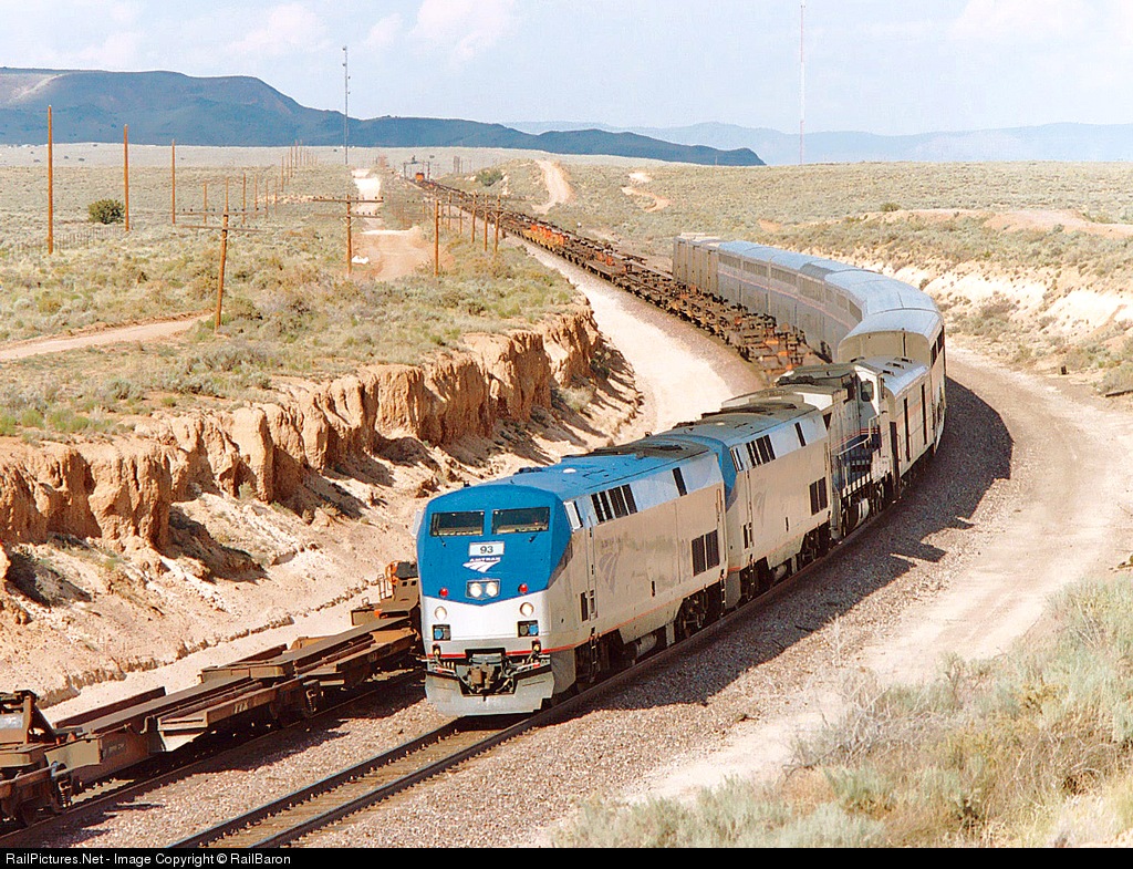 | The Southwest Chief has just rejoined the Transcon at Dalies, NM. El Cerro de Los Lunas looms in the shadows of afternoon clouds in the background as the Chief accelerates to 90 MPH on Main Track 2 as it runs past a baretable trian. |