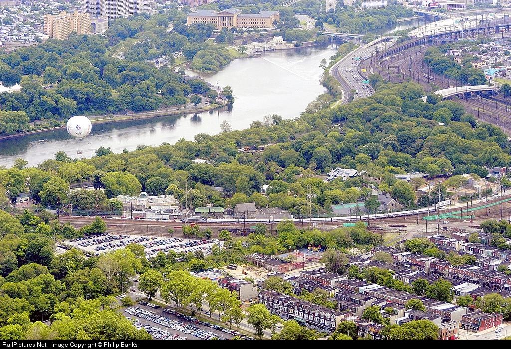 Amtrak ACELA train heads northbound toward NYC @ 1:25pm, seen here passing the Philly zoo, Note the Channel 6 news balloon & the Philadelphia Museum of th Arts