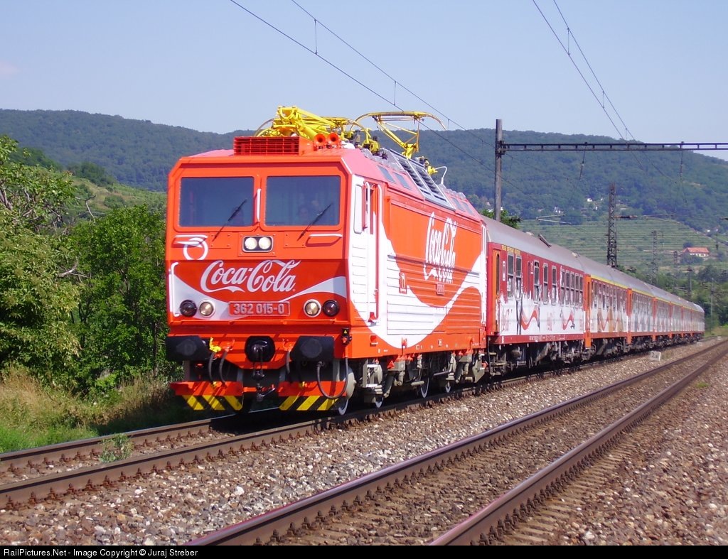 | CocaCola Music Train coupled behind the very first locomotive in Slovakia with an advertising scheme. This is a special train which brings people to concerts all over the country with a different disco in each vehicle. |