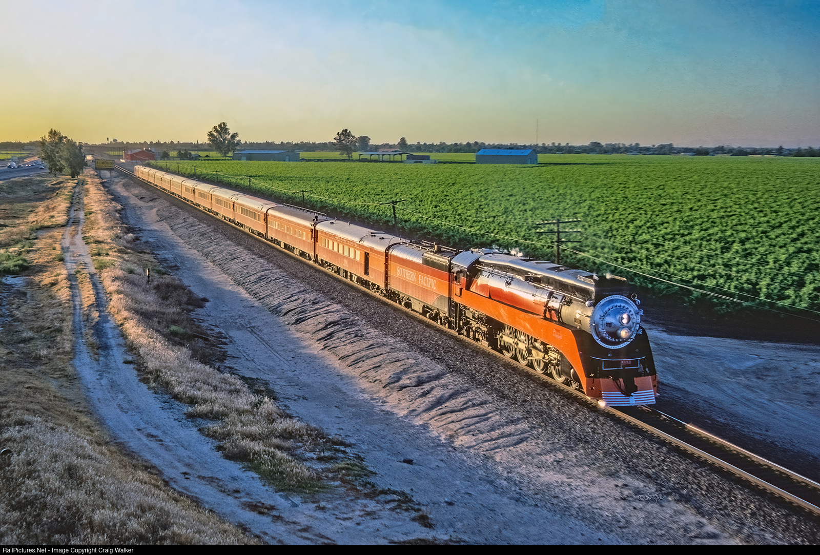 At last light, Southern Pacific Daylight GS-4 4-8-4 4449 and her 13-car train speed through California's verdant San Joaquin Valley as the train approaches Fresno, where it will lay-over for the night before heading to Los Angeles the next day. This train was heading to New Orleans for the 1984 World's Fair, and was dubbed the World's Fair Daylight. (Borden, California – May 12, 1984)