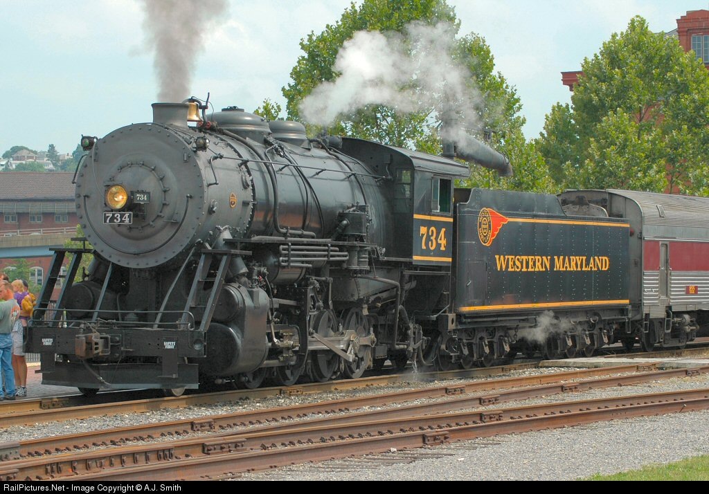 RailPictures.Net Photo: WMSR 734 Western Maryland Scenic Railroad Steam 2-8-0 at Cumberland, Maryland by A.J. Smith
