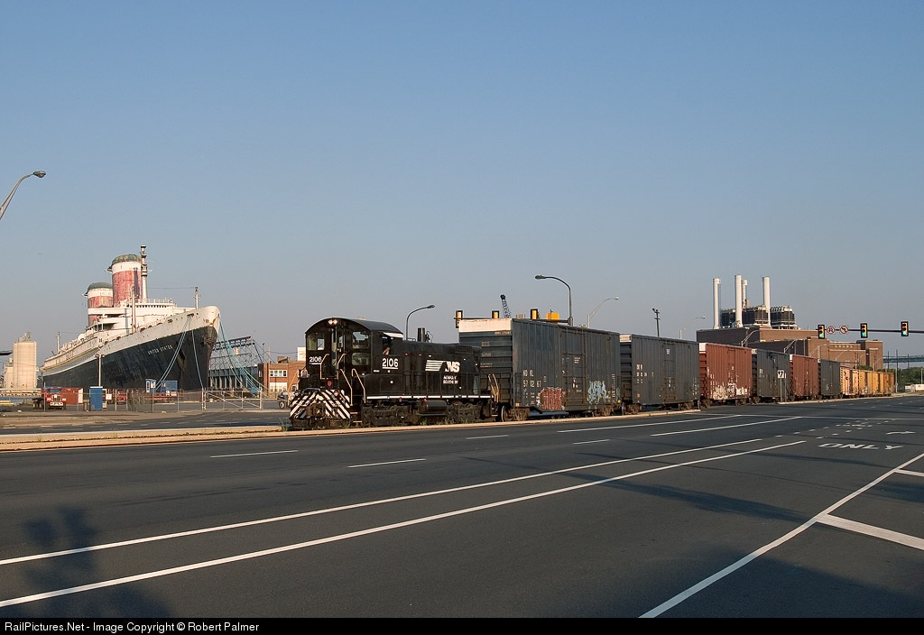 NS 2106 passes the SS United States again, moving along Delaware Ave to switch the next pier.