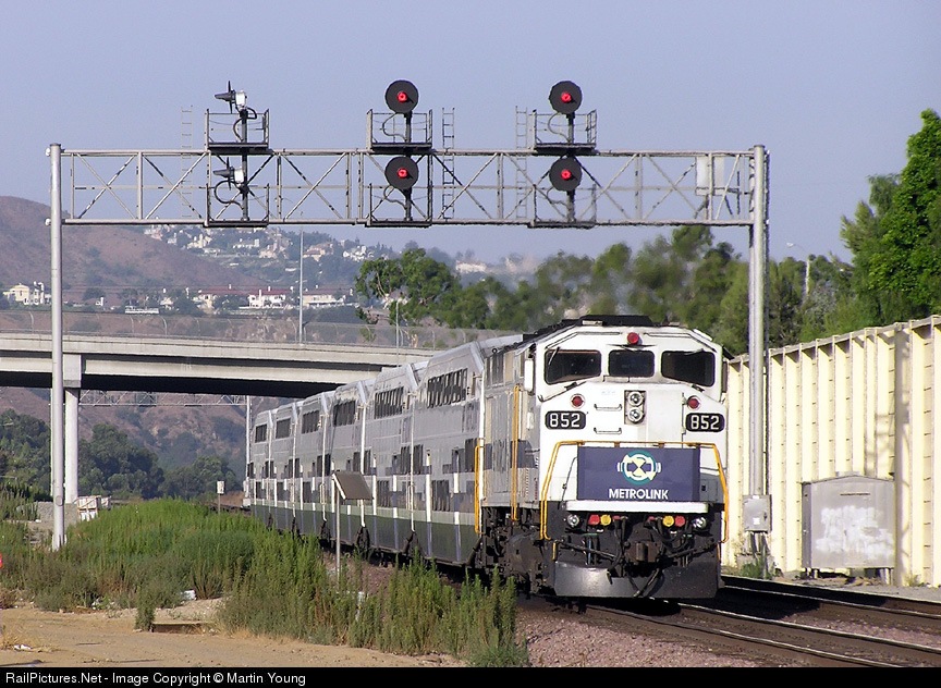 | An empty Metrolink train pushes West through Esperanza on it's way to San Bernardino to get staged for Monday's rush hour. Note the turned signals, set in place for the third track soon to come. |