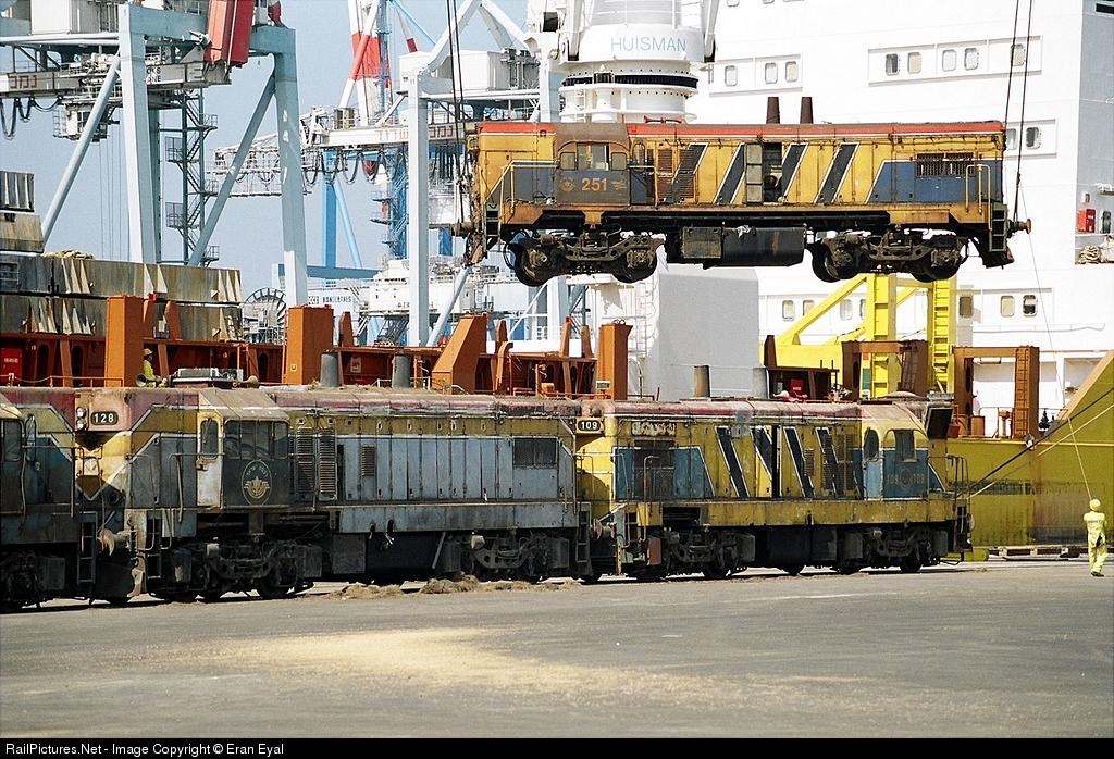 Six locomotives sold by I.R. to NRE on their way to Houston, TX. - locomotive 251, the only G8 locomotive in Israel lifted by the ship crane over 109 and 128 locomotives on his way to usa