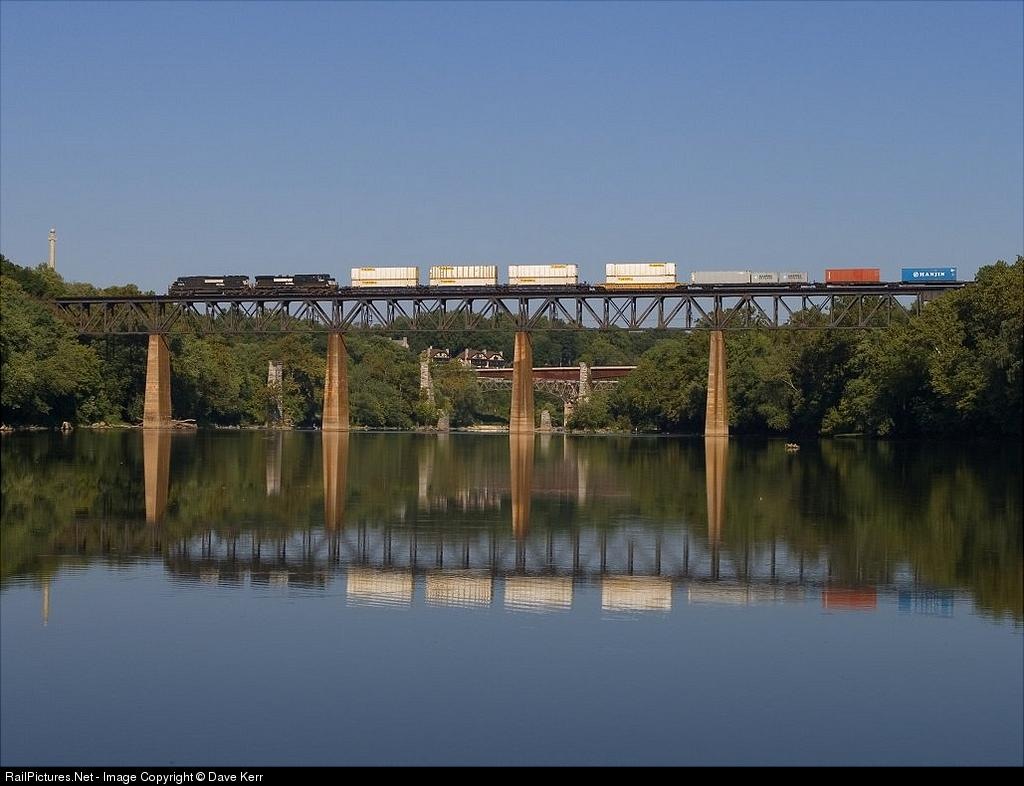 This southbound intermodal crossed the tranquil Potomac River at 1000 today. Canon 20D and 24-70mm lens.