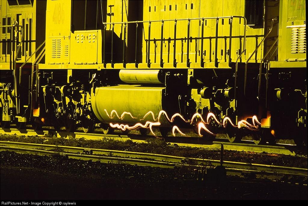 The conductor's lamp outlines his trail as he inspects his train before heading east out of Sparks.
