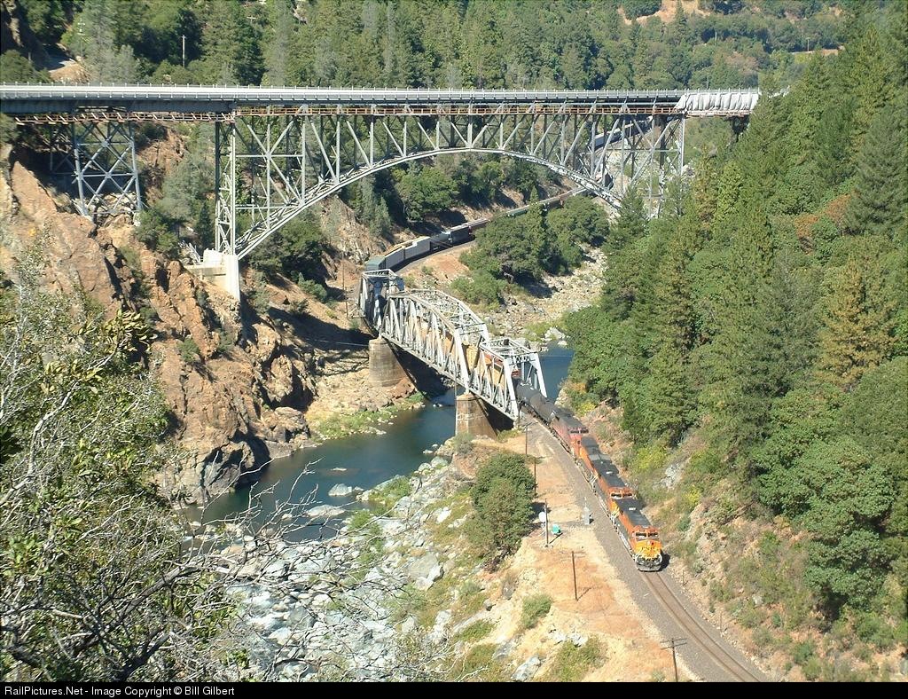 A BN trackage-rights train westbound on UP's Canyon Sub at Pulga. The upper bridge is for automobiles, as the tracks and the highway trade sides of the canyon here.