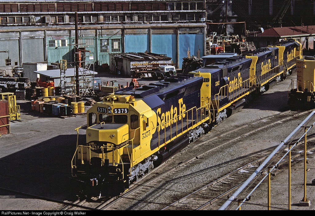 Fresh out of the shops, an A-B-B-A set of Santa Fe SD45s rests in the sun at the San Bernardino, California backshop before being assigned to their first train since rebuilding. The units are SD45 5375 (ex-5622), SD45B 5502, SD45B 5501 and another SD45.