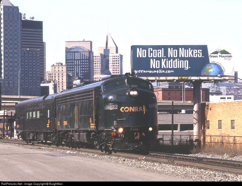 With the Pittsburgh skyline in the background, a Conrail business train passes an interesting Green Mountain billboard