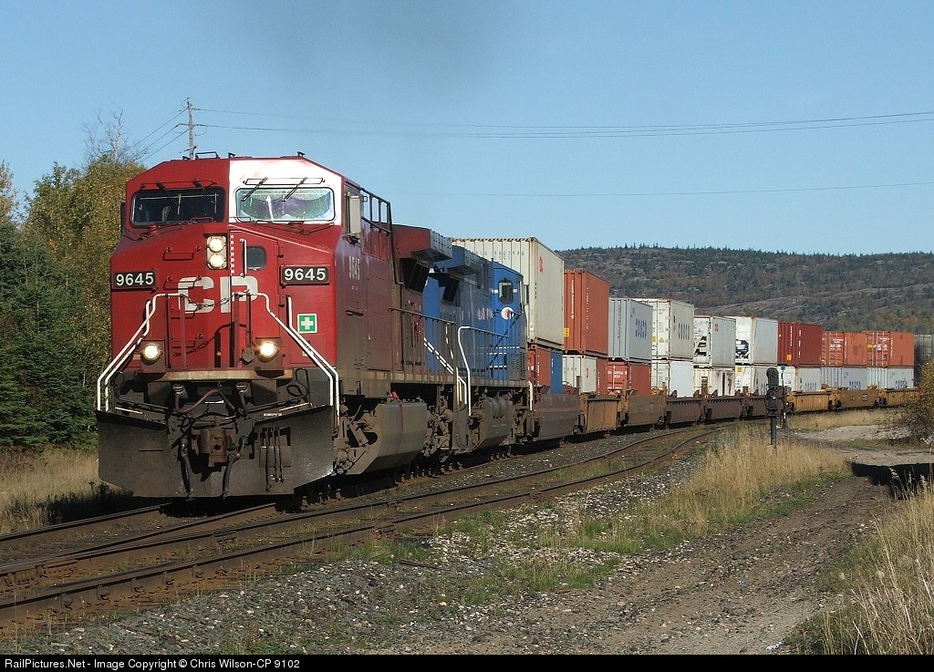 | CP #108-CP 9646, CEFX 1049, intermodal, 14 t/e autoracks-344 axles @ 11:45 |