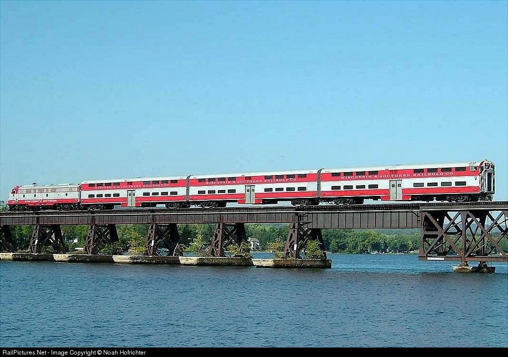 | The WSOR's Employee appreciation excursion crossing the Bridge over the Wisconsin River at Merrimac WI, after stopping at Devils Lake for a lunch for the employees and their families. |