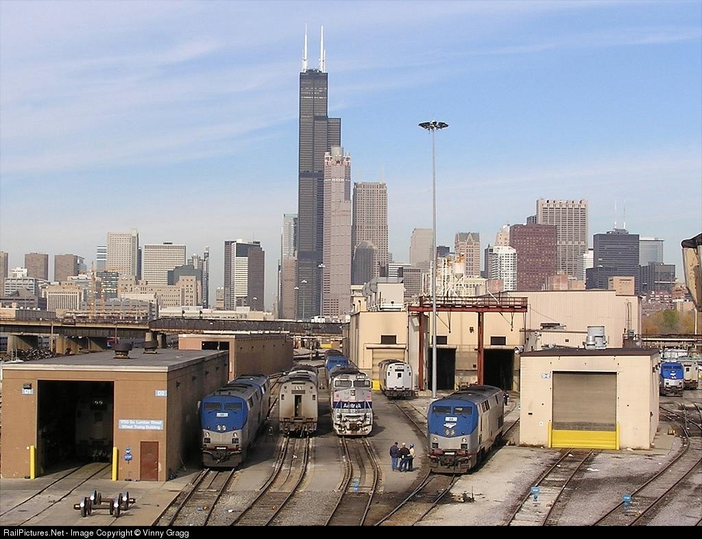 | With the stunning Chicago skyline in the background, Amtrak P32 519, P42 30 missing its logo, and P42 35 await their next assignments. |