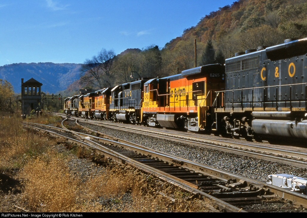 A westbound train passing Prince, WV, on the C&O in October, 1980. The classic C&O wooden tower is the abandoned NI Cabin which will remain for only a short time until the CSX cleanup campaign a few years later.