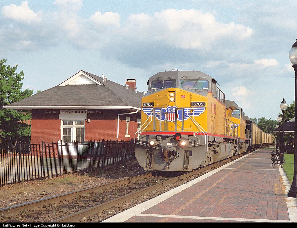 An Ex-CNW motor in fresh UP paint, UP 6705 cruises by the platform at Lee's Summit, MO on the directional Sedalia Subdivision. To view the rest of the images from this album, please visit: http://railbaron.rrpicturearchives.net/archivethumbs.aspx?id=9537