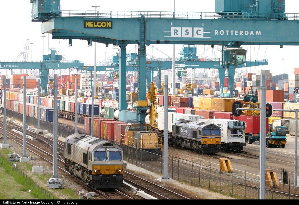 ERS Railways PB10 runs light engine as it passes Railion 6470 and Shortlines PB01 working the RSC container terminal in the port of Rotterdam.