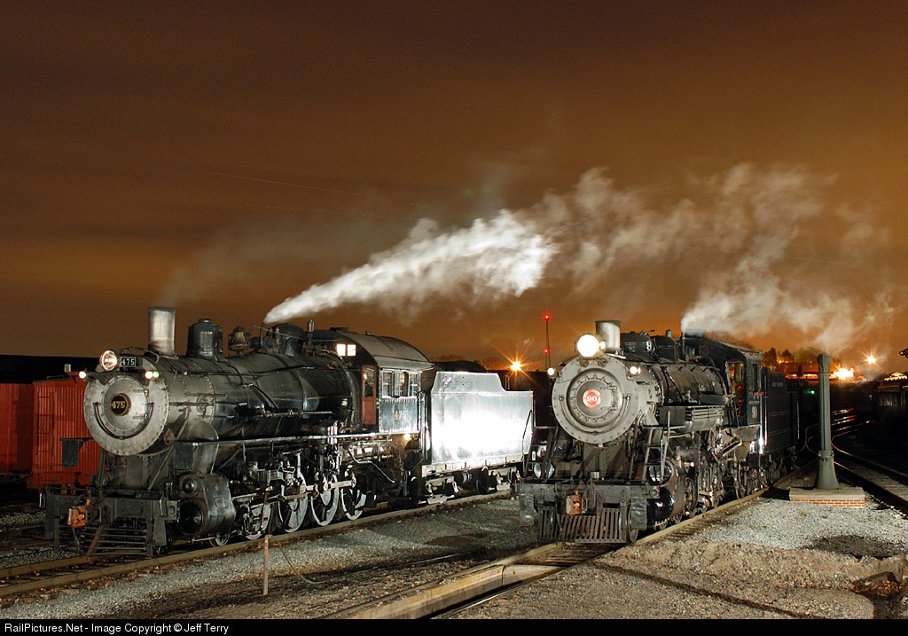Strasburg steamers 90 and 475 pose for night photos at Strasburg. Lighting by Victor Hand and Jim Gunning.