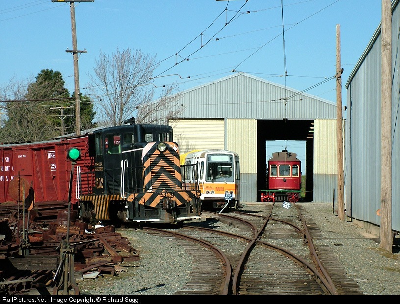 Looking north at the one of the WRM's maintenance shops, with equipment outside including Visalia Electric 502 and one of SF Muni's first modern LRV's.