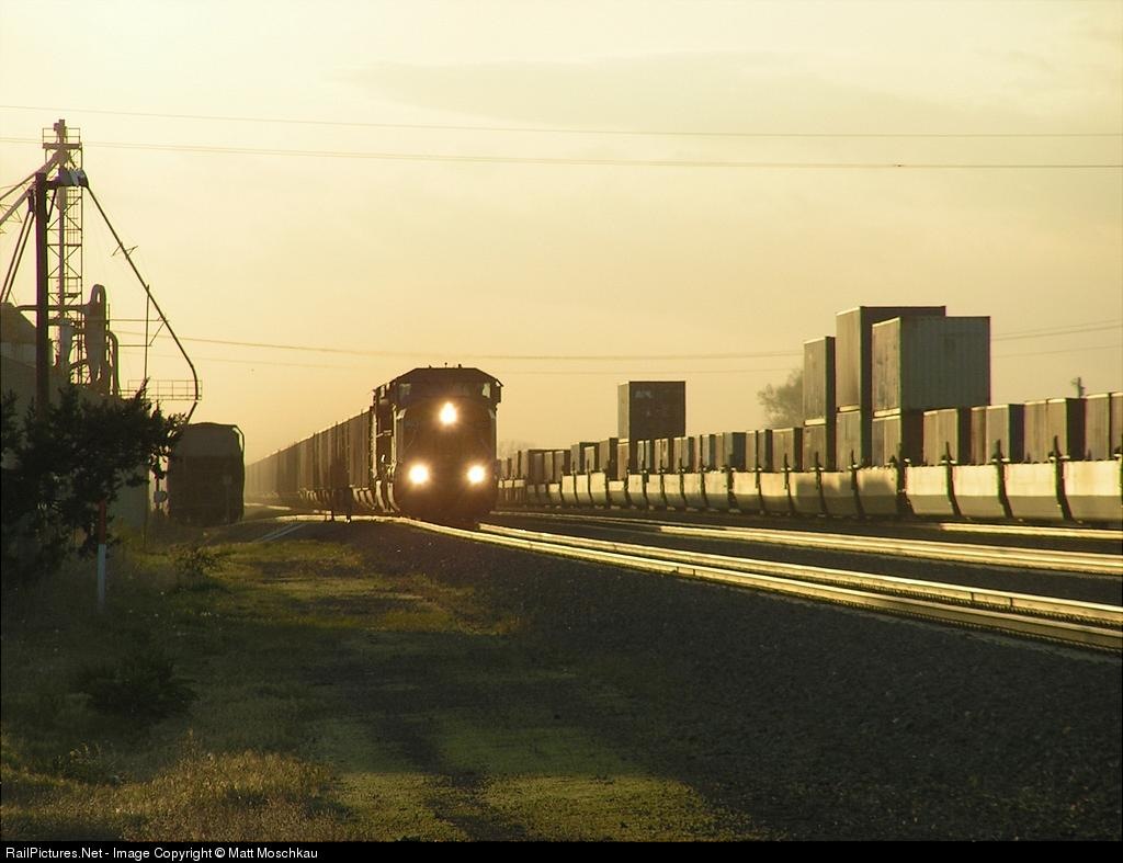 Eastbound coming into town as the sun sets, westbound just started to roll