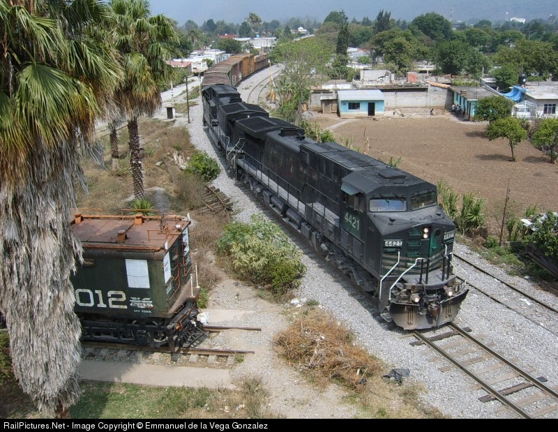 | FSRR 4421 northbound at Encinar SC, the 'new' (1985) line to overcome the Sierra Madre from Veracruz to Mexico City. FCM 1012 stands as a monument to former electrified section of this railroad, abandoned and substituted in 1985 by this new line. |