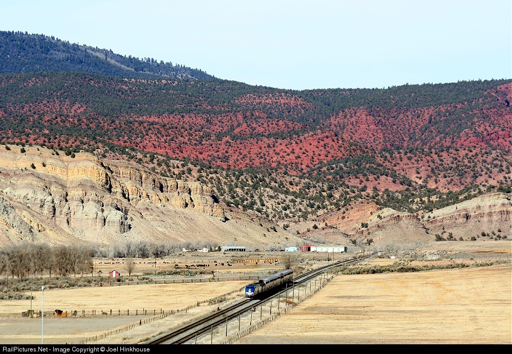 | Hillside view of Amtrak #5 racing through Range Siding in the Colorado River Valley, trying to make up a few minutes (running about 90 minutes late here). |