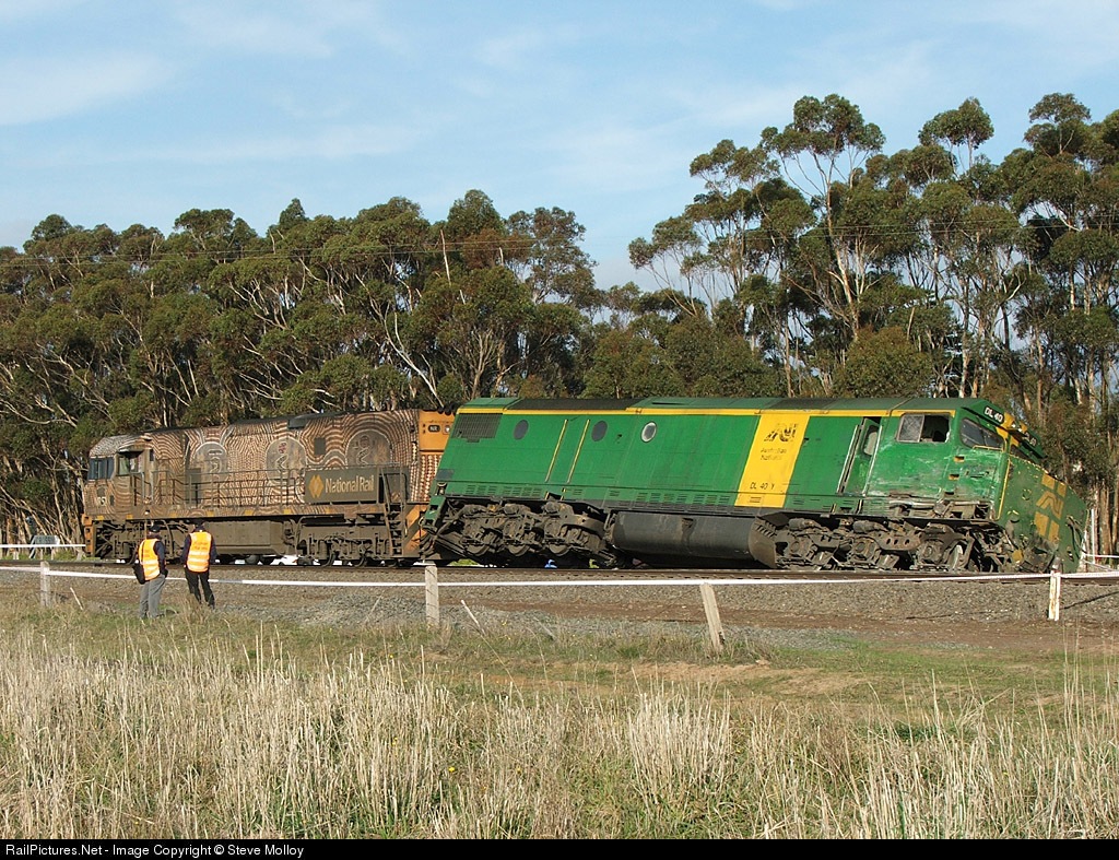 | NR52-DL40 near Lismore after being driven into by a truck, derailing 40+ wagons and burying a 3'rd loco. Click Here to view more shots of the accident. |