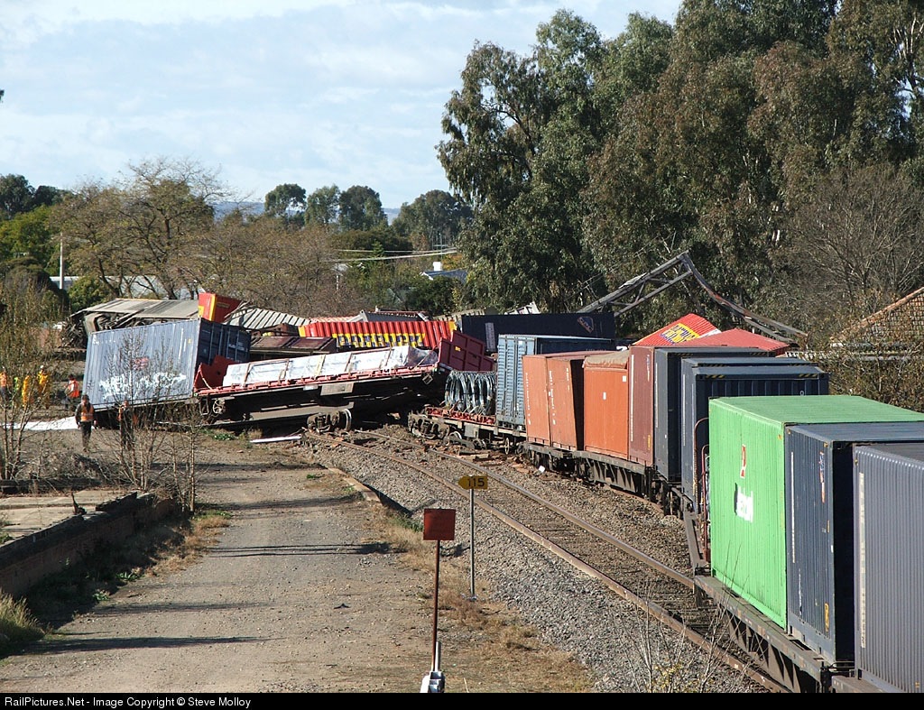 | EL56-EL58 lay on their sides, while the leading portion of their train lays zig-zagged behind. Click Here to view more pictures of the derailment. |