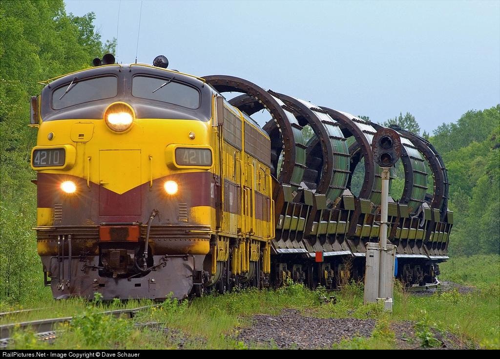 | Rare move on the former LTV Steel Mining Company railroad in northeastern Minnesota. Moving grinding mill parts that have been sold. Note modified side dumps used for the haul. |
