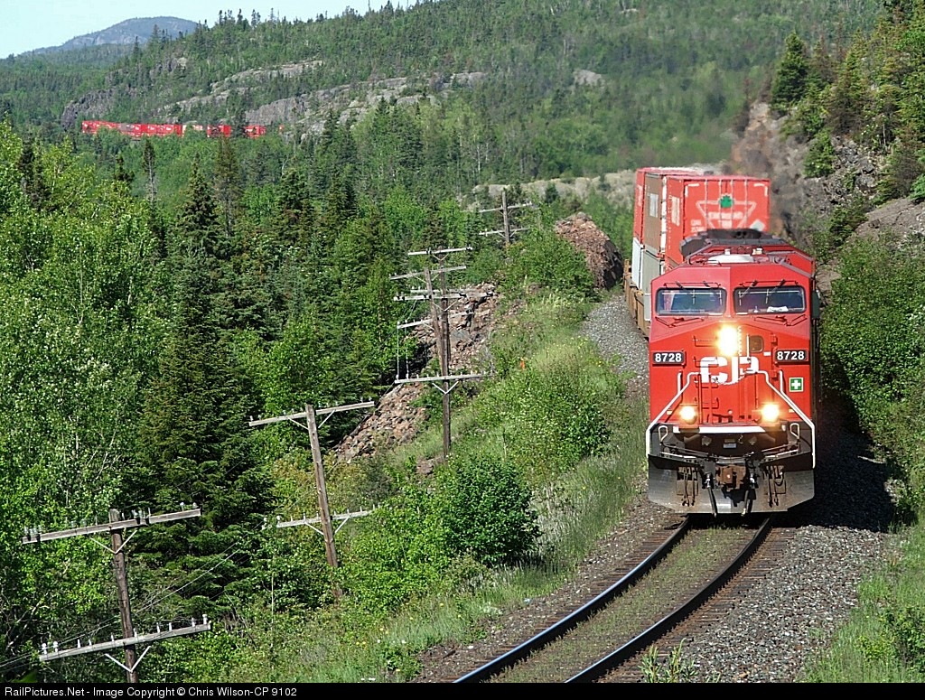 | CP 8728 heads through the curves around Port Munroe, meanwhile the tailend (K Line boxes) is passing Craddock Cove. A twisty section of mainline that allows one to see each end of the train. |