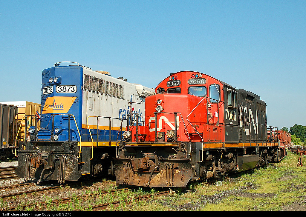 CN 7060 and railink 3873 sit in the brantford yard on Canada day