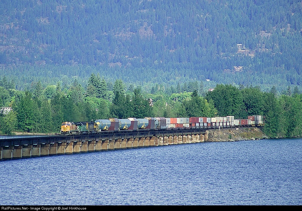 | A trio of 737 fuselages, parts, plus some hot container freight roll across Lake Pend Oreille. |