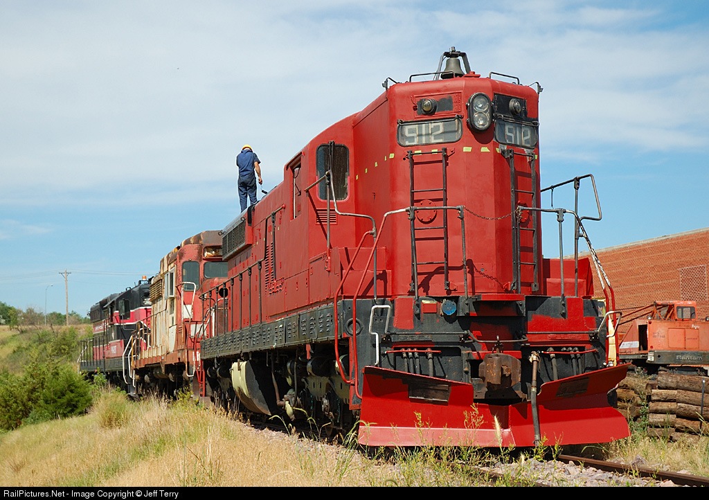 | Dakota Southern 512, ex- Milwaukee Road 2212. 512 (built by EMD in June 1953) is being repainted at Chamberlain in a line up that includes former Soo Line GP30 719 and ex-SP SD9E 4427. |