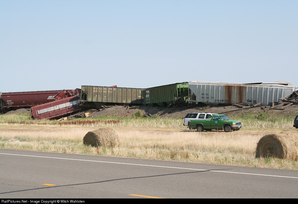 | A 110-car loaded unit soybean train from Breckenridge, MN to Seattle, WA derailed 20 cars today just west of McKenzie, closing the heavily used Jamestown sub. The cause of this derailment was found to be a sun kink brought on by an ambient temperature approaching 108°F. |