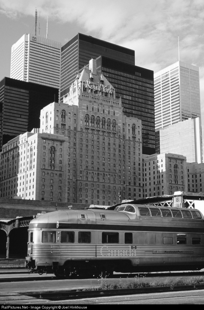 The Revelstoke Park rests at the end of The Canadian at Toronto Union Station. In the background, another soon to be former CP property, the Royal York, looms.