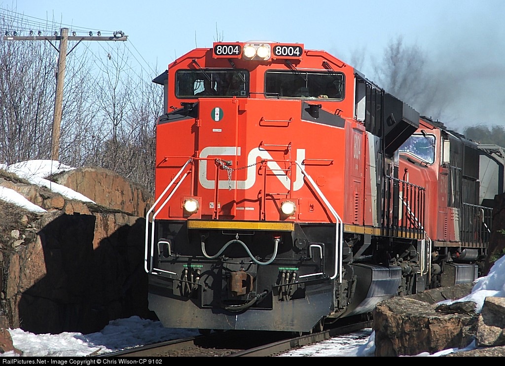| After a quick crew change at Falding, CN E201 begins its trek to Capreol and then on towards Vancouver, BC - CN 8004 & CN 5719 with 50 grain empties + 42 mixed |