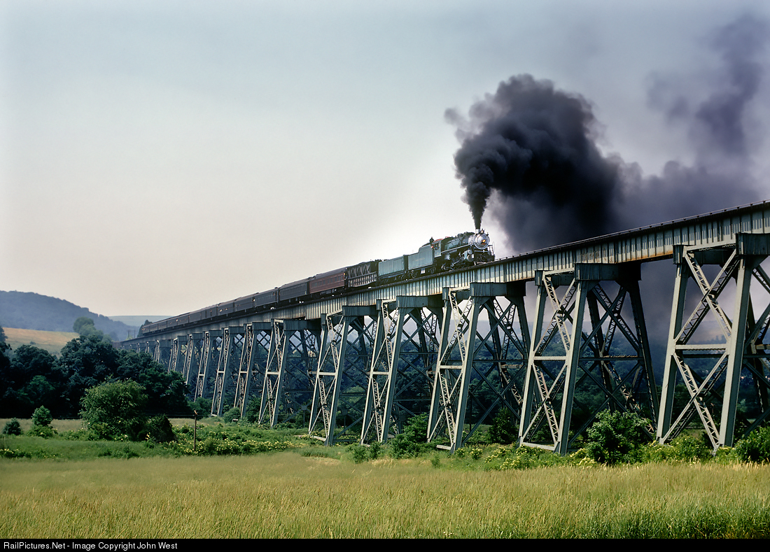 | The Independence Limited on the now abandonned Western Maryland Salisbury Viaduct near Meyersdale, PA. The 4501 was making a ferry move from Pittsburg to Hagerstown via the P&WV and WM. Thanks to several viewers for this information. |