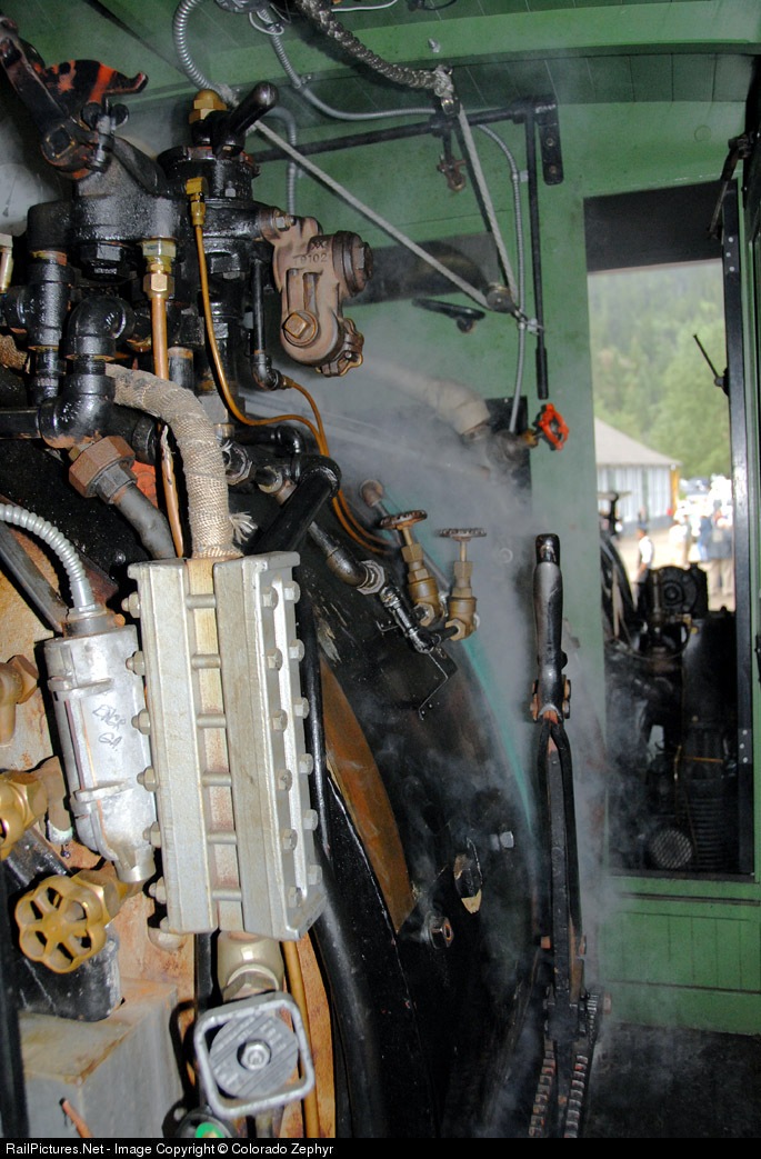 Colorado Historical Society milestone - Colorado & Southern Cooke Locomotive Works 1884 restored to operation! Cab view shows tight fit for engineer. Colorado Day celebration.