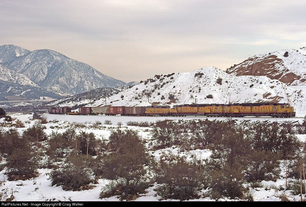 | Union Pacific DDA40Xs 6937 and 6921, along with a GP30B, take an eastbound manifest over Cajon Pass on a snowy December 30, 1974. |
