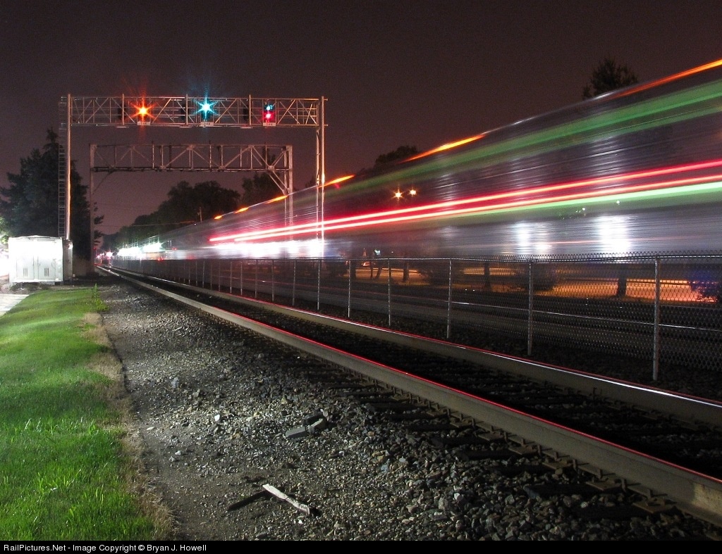 The last inbound of the night passes under the new signal bridge at Stone Ave. while the old signal bridge stands watch. Big thanks to Kevin V. for the night photo lesson.
