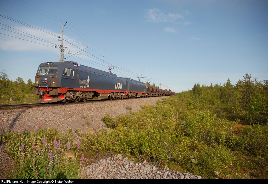 Oretrain with 52 cars from Kiruna (LKAB) to Narvik. loc 105 = Narvik; loc 106 = Kiruna