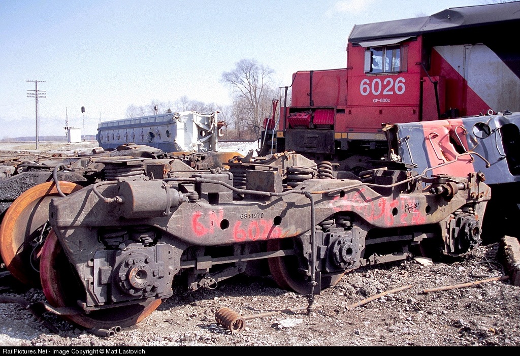 CN 6026 was trailing unit on a southbound UP train that drilled the side on an NS train at Pence. The long hood of MEC GP40-2 #375 can be seen off to the right. The lead truck off the CN unit is in the foreground.