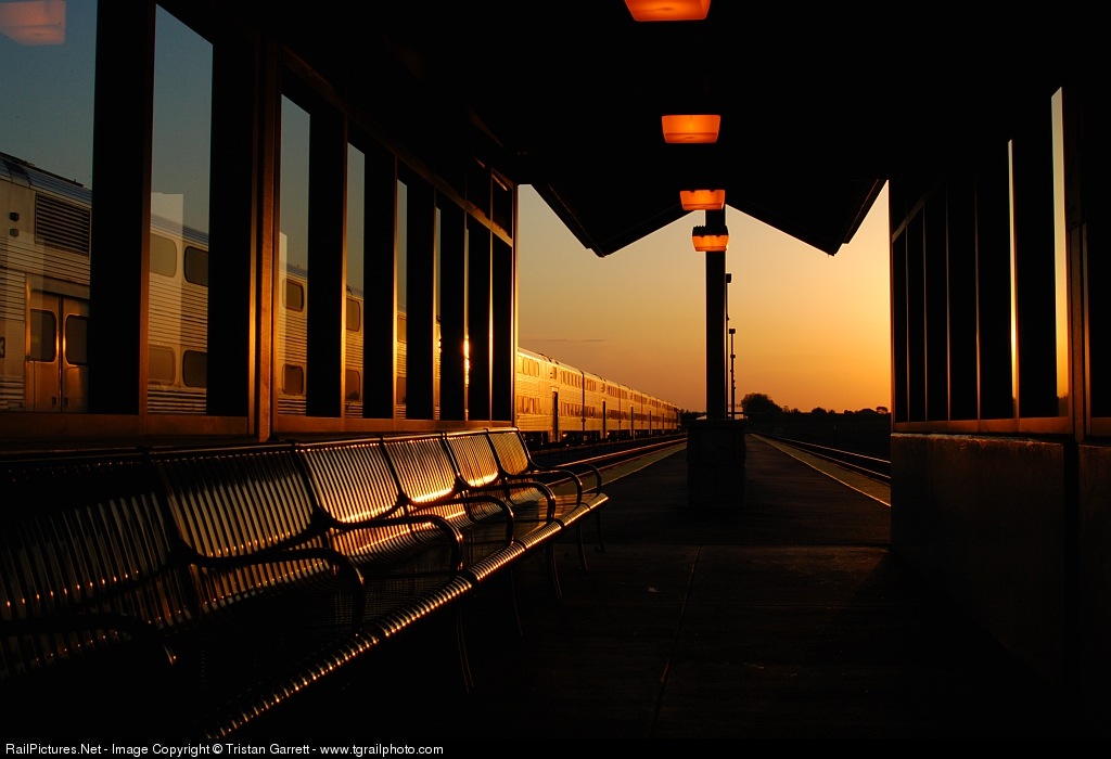 On a surprisingly warm and beautiful April evening, the shelter for passengers awaiting eastbound trains in La Fox is illuminated by the setting summer sun. Unfortunately, recreation of this photograph is now impossible; doors have been placed at the end of the shelter.