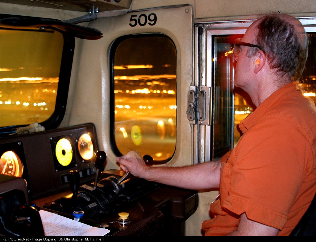 | Amtrak engineer Phil Secor has his work cut out for him as he tries to maintain a Talgo schedule with P32BWH 509. This time exposure is on the head end of train 517 en route from Vancouver BC to Seattle WA. |