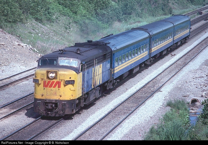 | Via's 6758 races westbound with an Ottawa bound train in 1984. The 6758 was the original prototype for the Canadian only FPA4 model. It lacks the bottom half of the radiator grille and is shorter than a production FPA4. |