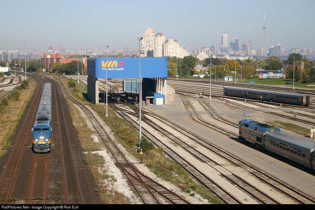 | VIA 913 blasts westward by VIA's TMC with 10 HEPII cars with Toronto's skyline as a background. 75 made the 6 mile trek from Union Station to Mimico in 13 minutes. |