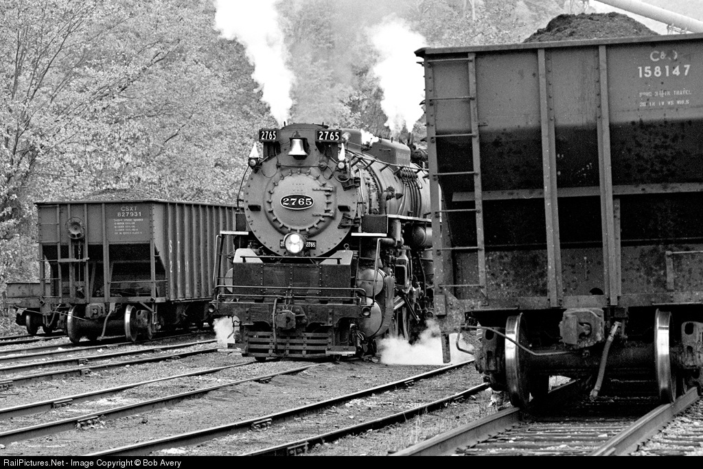 | Nickel Plate Berk #765 (disguised as C&O #2765) rests at Meadow Creek after turning, before taking return New River Gorge special to Huntington. She looks at home in between the rows of coal hoppers. |