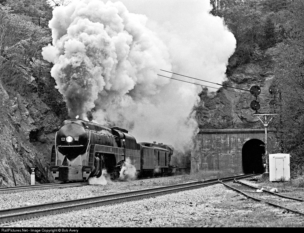 The 'J' bursts through Montomery tunnels with a westbound excursion from Roanoke on a damp morning. I should have shot a second or two earlier to hide the diesel.